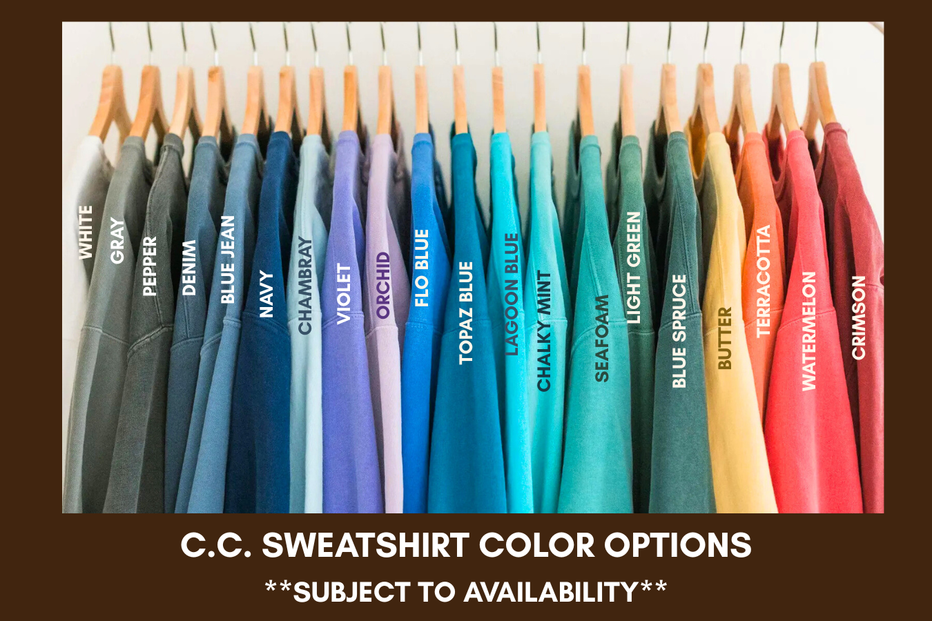 Please note that CC only comes as dark as the pepper color. If you'd like Pepper crewneck, select "Custom Color" option, and input color in the notes. CC only goes up to 3X, per the manufacturer. Softstyle goes up to 4XL. 5XL will be available in Gildan (or similar) varieties. Black is available in GILDAN ONLY.